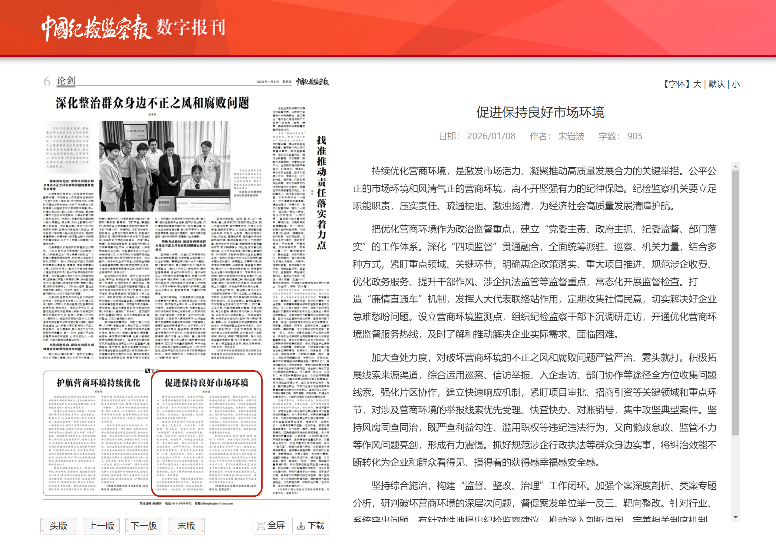 持续优化营商环境,是激发市场活力、凝聚推动高质量发展合力的关键举措。公平公正的市场环境和风清气正的营商环境,离不开坚强有力的纪律保障。纪检监察机关要立足职能职责,压实责任、疏通梗阻、激浊扬清,为经济社会高质量发展清障护航。