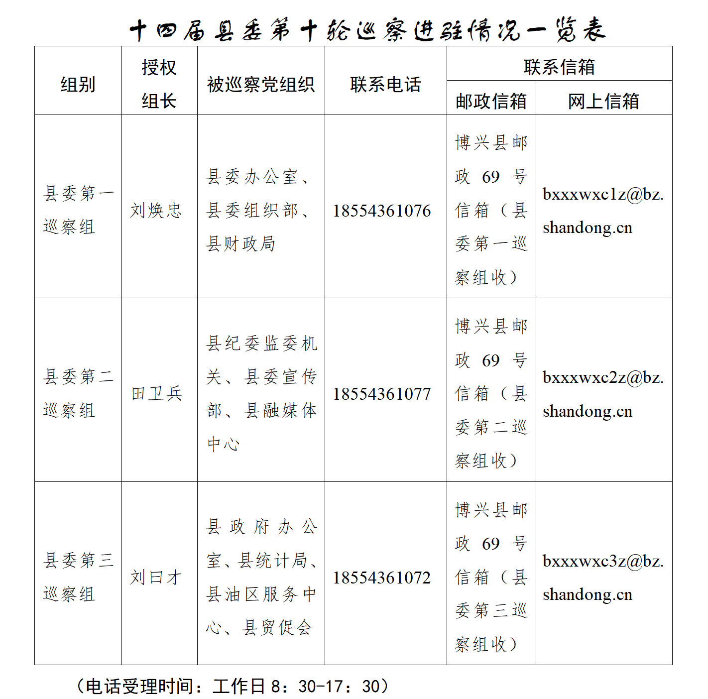 据悉,3个县委巡察组将开展为期3个月左右的现场巡察,受理信访时间截止到2026年6月3日。期间设立专门值班电话、信箱和邮政信箱,主要受理反映被巡察党组织领导班子及其成员、县委管理的其他干部及下一级主要负责人的问题以及与巡察工作有关的信访事项等。