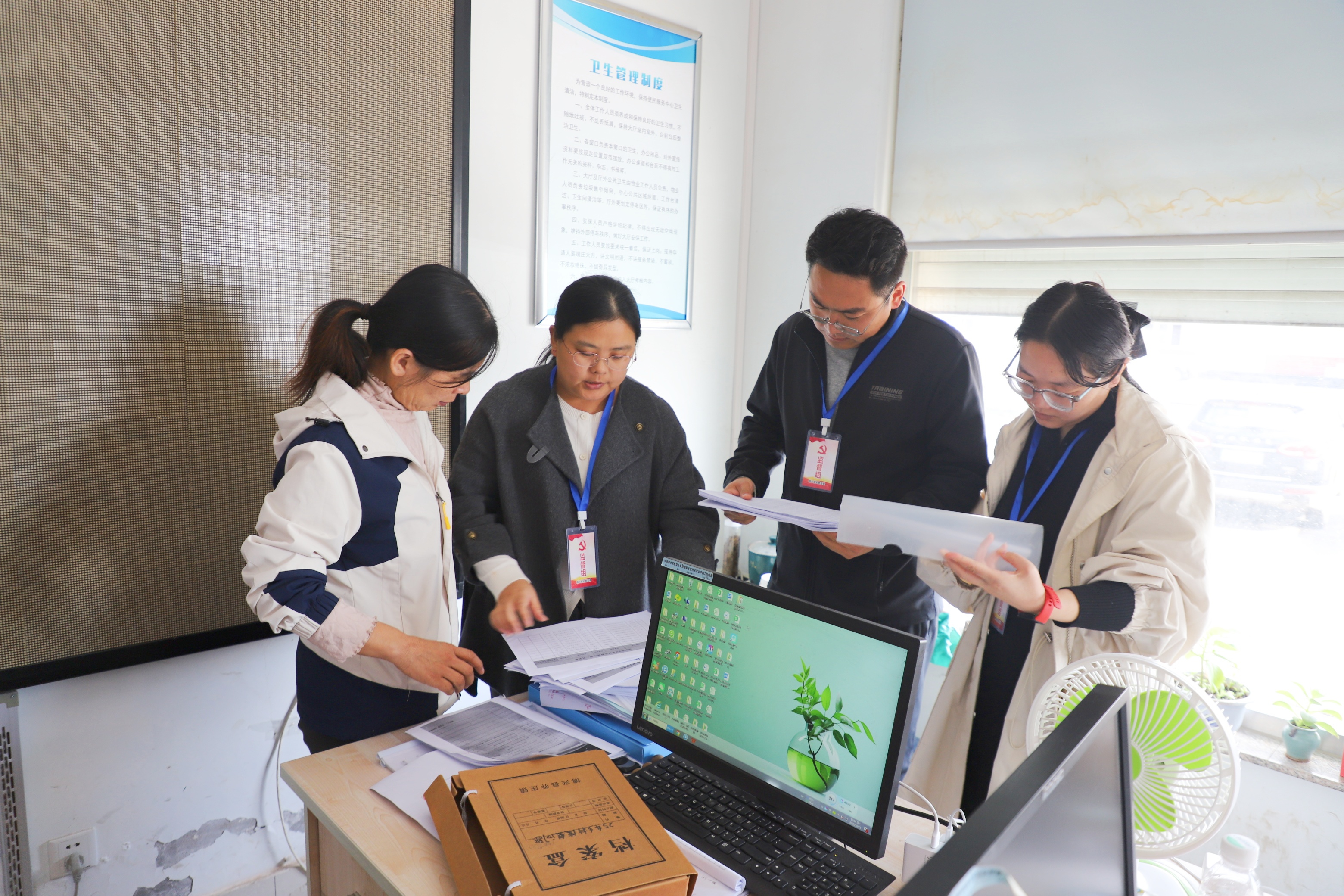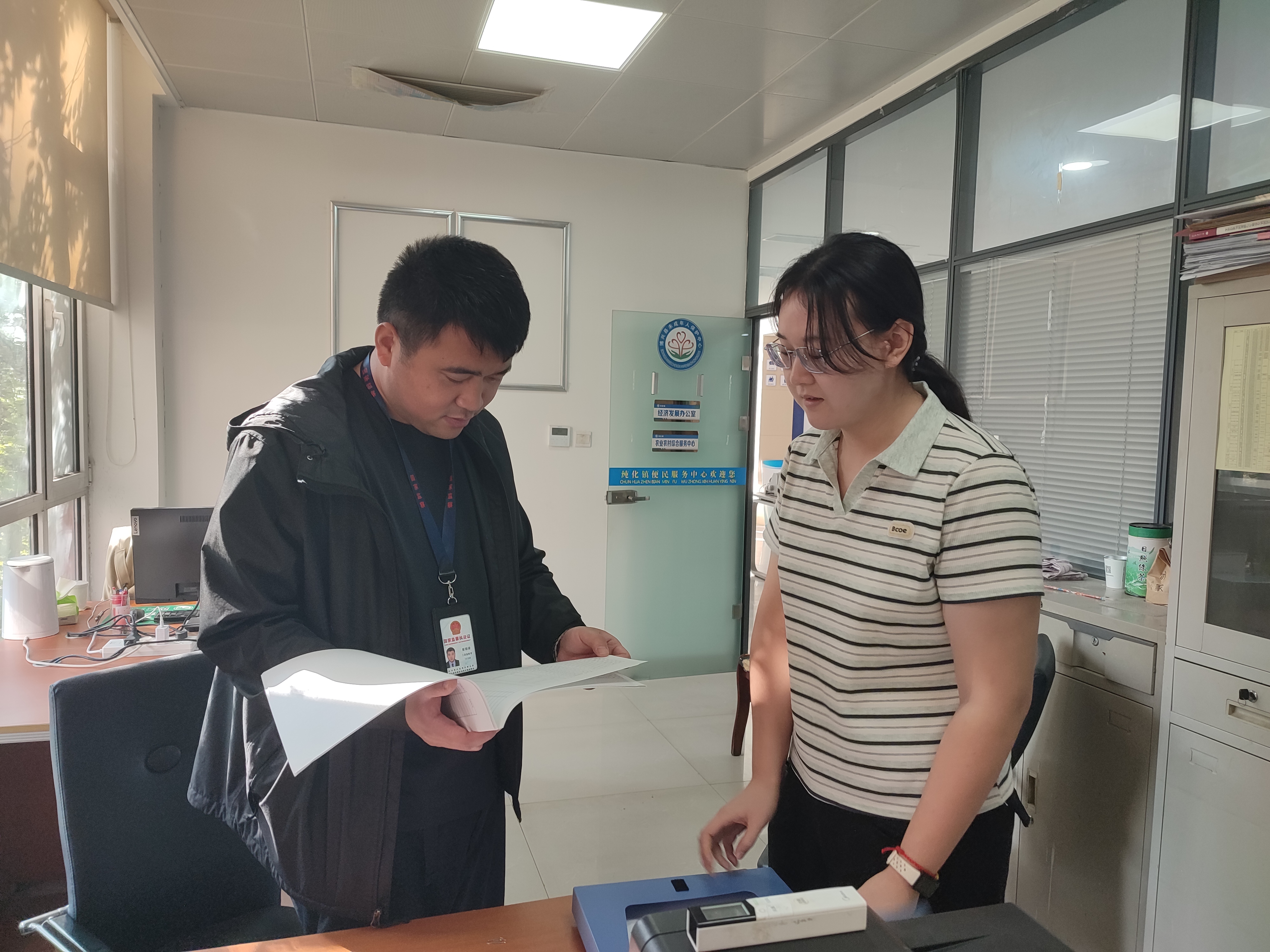 近日,乔庄镇纪委紧盯公益岗管理关键环节,联合镇人社所工作人员,深入人社服务大厅,对公益岗考勤打卡、薪酬发放、协议续签、人员调岗等台账进行核查,重点比对身份证、社保卡、考勤记录“三合一”信息一致性,查看是否存在虚报冒领、人情安置、长期脱岗等突出问题,督促人社所、各管区、行政村拧紧责任链条,确保岗位安置阳光透明、补贴发放精准到人,真正把公益岗办成困难群众“稳增收、有尊严”的民心工程。图为乔庄镇纪委工作人员在人社所大厅对公益岗日常管理情况进行监督检查。