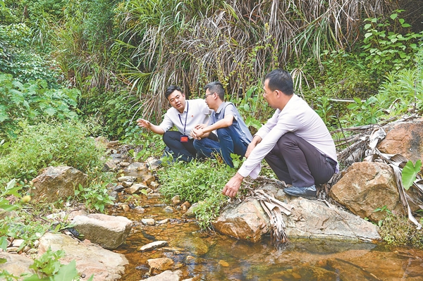 图为福建省莆田市城厢区纪检监察干部(左一)在木兰溪支流郑庄沟走访了解水质提升工作落实情况。林朱平 摄