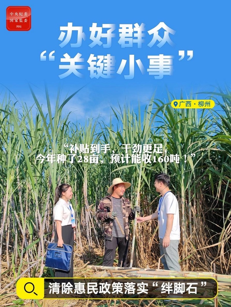 深入贯彻中央八项规定精神学习教育开展以来,柳州市纪委监委深化民生领域监督,紧盯影响甘蔗产业发展难点堵点,深入排查妨碍惠民政策落实的“绊脚石”,积极回应民生期盼,办好群众“关键小事”。
