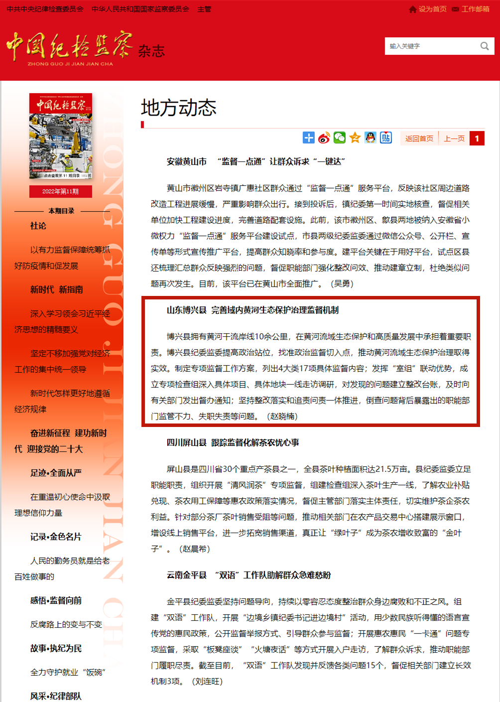 博兴县拥有黄河干流岸线10余公里,在黄河流域生态保护和高质量发展中承担着重要职责。博兴县纪委监委提高政治站位,找准政治监督切入点,推动黄河流域生态保护治理取得实效。制定专项监督工作方案,列出4大类17项具体监督内容;发挥“室组”联动优势,成立专项检查组深入具体项目、具体地块一线走访调研,对发现的问题建立整改台账,及时向有关部门发出督办通知;坚持整改落实和追责问责一体推进,倒查问题背后暴露出的职能部门监管不力、失职失责等问题。