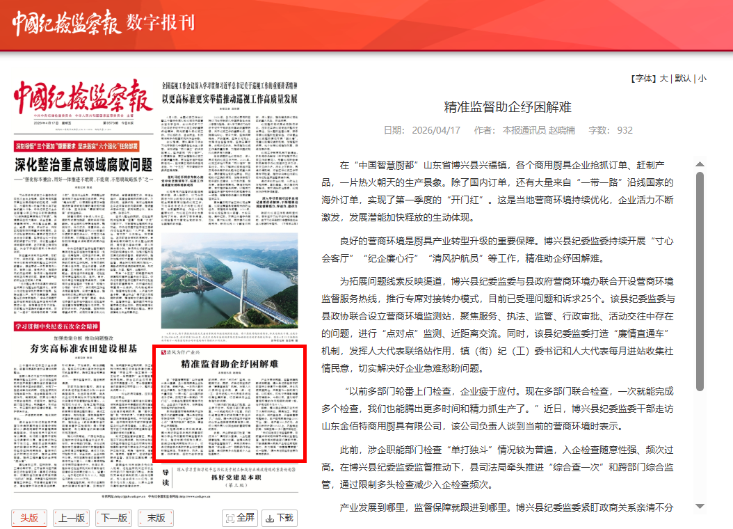 “以前多部门轮番上门检查,企业疲于应付。现在多部门联合检查,一次就能完成多个检查,我们也能腾出更多时间和精力抓生产了。”近日,博兴县纪委监委干部走访山东金佰特商用厨具有限公司,该公司负责人谈到当前的营商环境时表示。