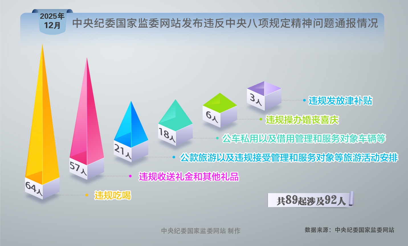 2025年12月,中央纪委国家监委网站共发布17期违反中央八项规定精神问题通报,共89起涉及92人。通报中涉及违反中央八项规定精神问题的行为主要有:违规收送礼金和其他礼品,违规吃喝,违规操办婚丧喜庆,违规发放津补贴,公款旅游以及违规接受管理和服务对象等旅游活动安排,公车私用以及借用管理和服务对象车辆等。其中,64人存在“违规吃喝”情况,占比最高。