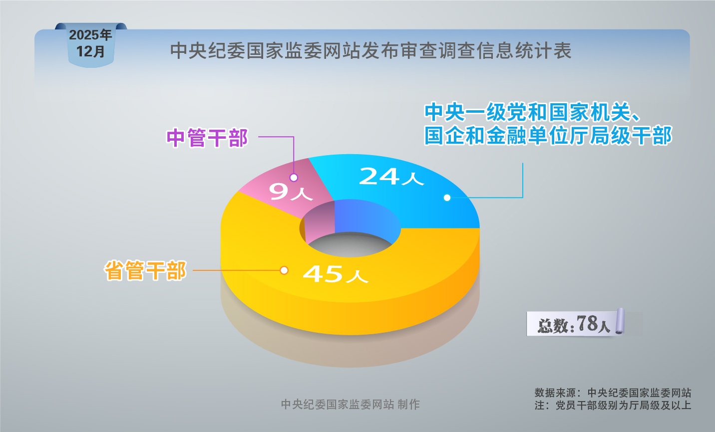 2025年12月,中央纪委国家监委网站共发布78条审查调查信息。其中,中管干部9人,中央一级党和国家机关、国企和金融单位厅局级干部24人,省管干部45人。