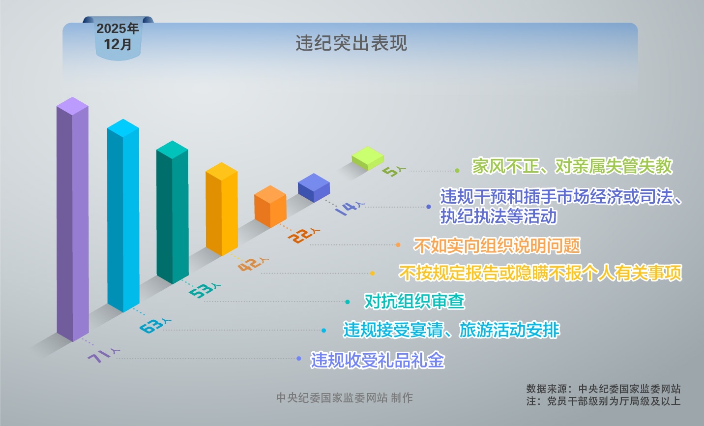 2025年12月,在中央纪委国家监委网站发布的党纪政务处分信息中,被处分党员、干部多数违反多项纪律。违反6项纪律的1人,违反5项纪律的14人,违反4项纪律的30人,违反3项纪律的22人,违反2项纪律的10人。