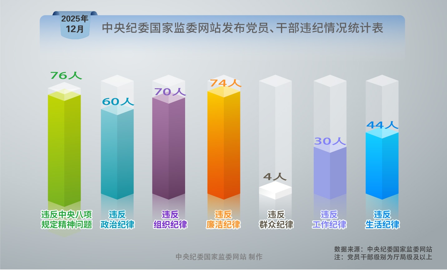 2025年12月,中央纪委国家监委网站发布的78条党纪政务处分信息中,76人违反中央八项规定精神,74人违反廉洁纪律,70人违反组织纪律,60人违反政治纪律,44人违反生活纪律,30人违反工作纪律,4人违反群众纪律。